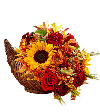 Cornucopia. Capture the essence of the autumn season with this inspiring and colorful arrangement. Rich red roses, bright and brilliant sunflowers, orange Asiatic lilies, burgundy daisies, solidago, red glycerized oak leaves and lush greens are beautifully arranged in a natural cornucopia basket that speaks of harvest traditions with each gorgeous bloom.